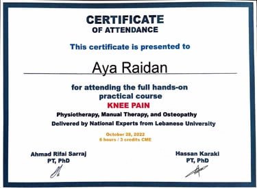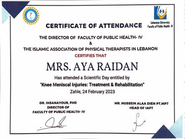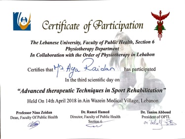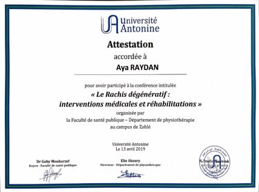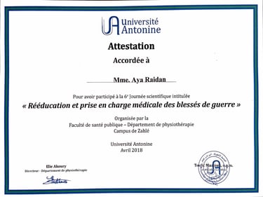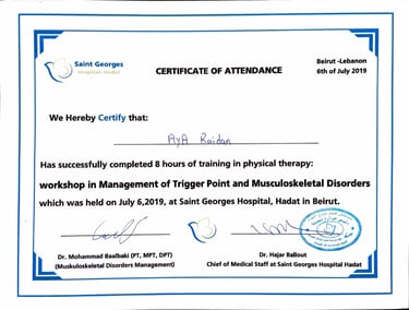 I’m a licensed Dr in physical therapy. Holding a Doctorate and a Master’s degree in Research, Handicap, Motor System & Rehabilitation in Physical Therapy from the Lebanese University. I am registered with the Order of Physical Therapy (LOPT Member No: R/048).My clinical expertise spans neurology, traumatology, orthopedics, sports rehabilitation, as well as pediatric and geriatric care.